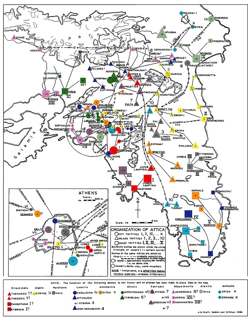 Each color stands for one of the 10 tribes, each mark for an individual deme. The lines link groups of demes that belong to the same tribe. The number within each mark records the number of representatives sent each year to the Council (Boule) from that deme. Source: J.S. Traill, "Demes and Tribes," 1986. Image: Agora.