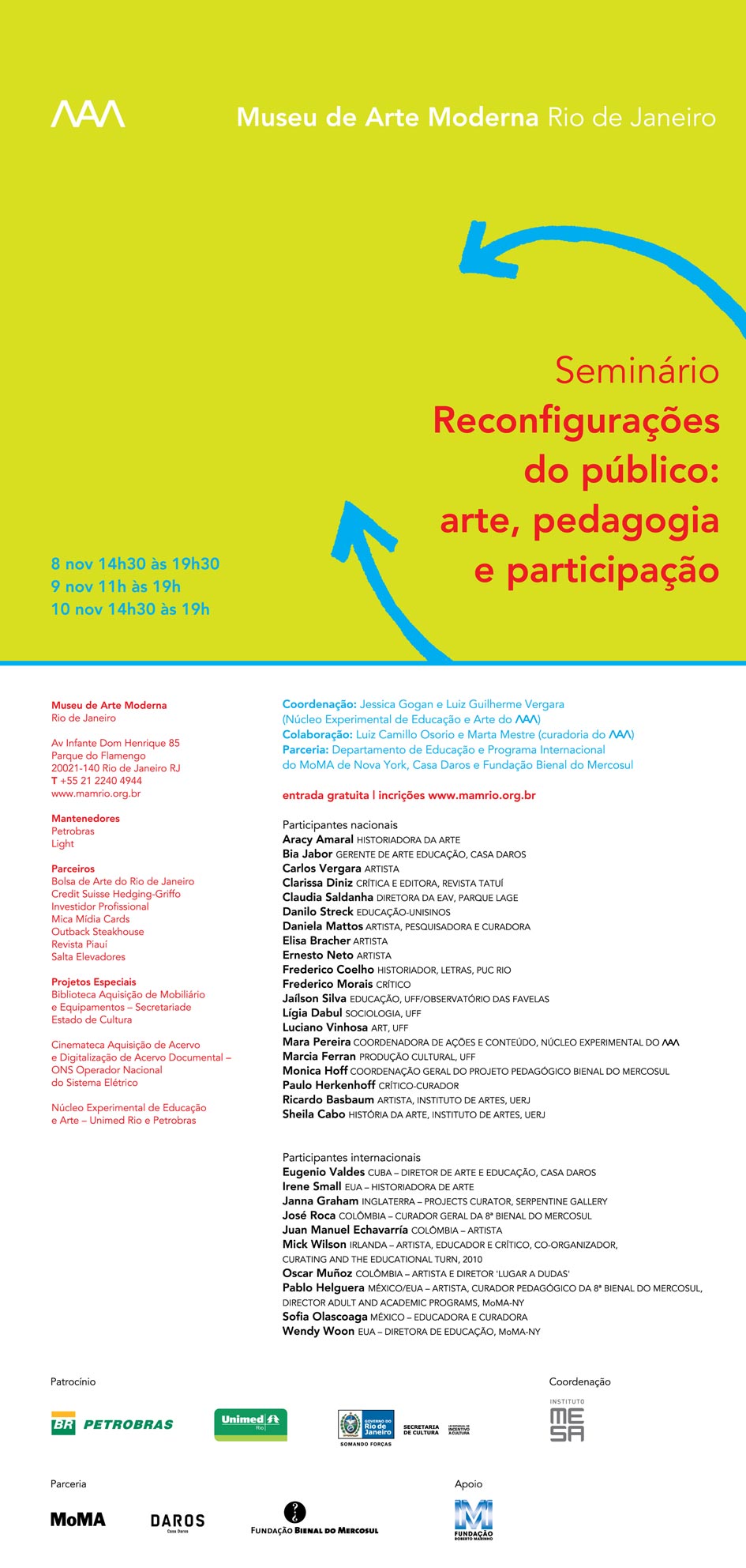 O Museu de Arte Moderna do Rio de Janeiro, em parceria com o departamento de educação e o programa internacional do MoMA de Nova York, a Casa Daros e a Fundação Bienal do Mercosul realiza de 8 a 10 de novembro de 2011 o seminário internacional “Reconfigurações do Público: Arte, Pedagogia e Participação”, um evento transdisciplinar que discutirá as perspectivas de atuação dos museus, instituições e espaços culturais alternativos no século 21. O evento, que terá mesas-redondas, oficinas e grupos de estudos, discutirá de que maneira artistas, curadores e educadores podem responder às demandas atuais da sociedade.