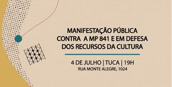 A manifestação será contra a diminuição do repasse à cultura presente na MP 841. Pela Medida Provisória, haverá redução de 3% para 0,5% das loterias federais ao Fundo Nacional da Cultura.