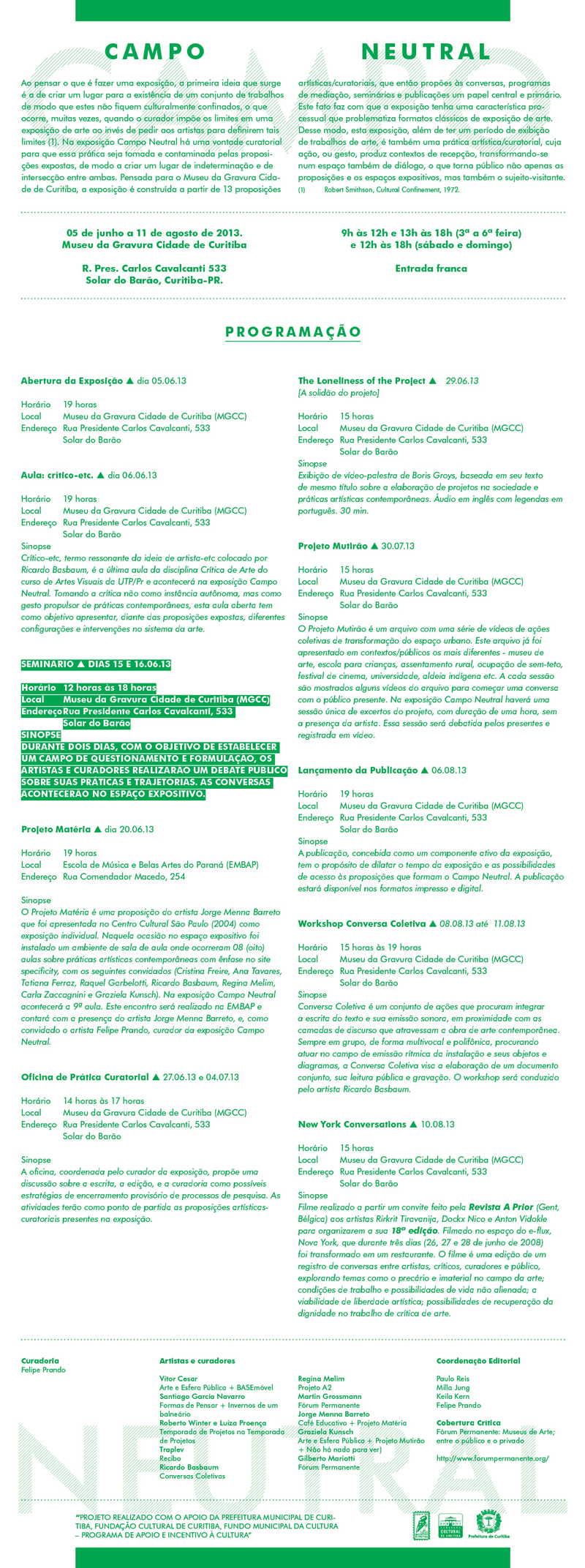 Vitor Cesar / Jorge Menna Barreto / Regina Melim / Roberto Traplev / Ricardo Basbaum / Roberto Winter / Graziela Kunsch / Luiza Proença / Martin Grossmann / Gilberto Mariotti / Paulo Reis / Milla Jung / Keila Kern / Santiago Navarro / Felipe Prando