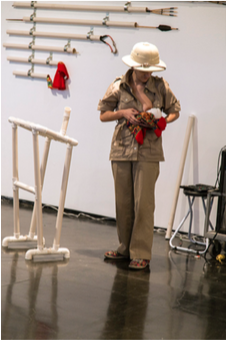 Também na performance que foi apresentada no interior do espaço expositivo no MAM-RJ, o mesmo tipo de processo ocorria. Vagueando no espaço expositivo, três mulheres vestidas segundo o clichê do explorador colonial (clichê que ainda por cima não corresponde necessariamente ao colono que chegou ao Brasil nos séculos XV e XVI mas sim a um imaginário genérico da colonização), vão acoplando nos seus corpos objetos luso-brasileiros recolhidos na pesquisa. São mulheres que se apropriam de um lugar tradicionalmente ocupado por homens onde se segue a máxima de Oswald de Andrade (“só me interessa o que não é meu”[8]) ao mesmo tempo que se reafirma o valor da imitação dos clichês até encontrar uma relação outra com a memória, desfeita dos dualismos. Repetir os clichês aqui, liberá-los das suas referências, funciona como estratégia de liberação de outros sentidos para a memória colonial.